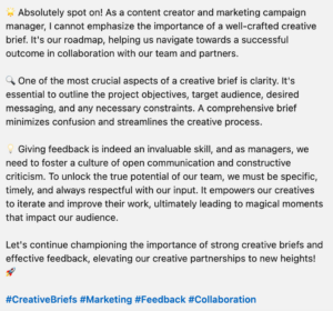 Creative briefs are the foundation of any good partnership. We’ve all seen briefs that are less than helpful, from vague descriptors to zero deadlines, briefs can cause all sorts of misalignments. We wrote all about the dos and don’ts of creative briefs here. But we wanted to ask our LinkedIn network what they can’t stand in creative briefs. Here’s what they had to say!