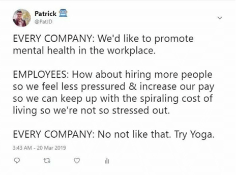 SVB: There are two issues. There are people, and then there are functions. The bottom line at the end of the day: Businesses need to meet the expectations of their customers. If they’ve promised customers a specific ROI, they want to know they are delivering on that ROI. They want to see productivity. That return is the result or the function; the work being done. But the reality is that those functions are being completed by humans. By people. And if people are not taken care of, if people are unwell in some way, be it mental or physical, it’s going to impact their ability to perform in their role and deliver what is being asked of them.