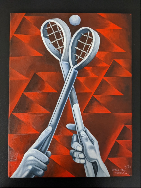Original artwork, Preston BarkThis is a game ball toss-up in our traditional game of stick ball, which is what lacrosse is based on. The triangular designs in the background are inspired by a traditional Cherokee design called “Road to Soco,” the community in Cherokee where I grew up that’s also known as Wolf Town.
